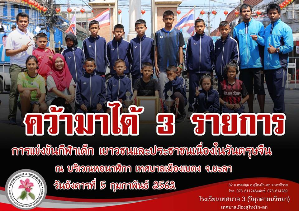 ขอบคุณ ผอ.ยุทธนา วังเพ็ชร์ ผู้อำนวยการโรงเรียนเทศบาล 3 (วิมุกตายนวิทยา) ที่เปิดโอกาสให้กับนักเรียนได้เก็บประสบการณ์ในโครงการแข่งขันกีฬาเด็ก เยาวชนและประชาชนเนื่องในวันตรุษจีน ณ บริเวณหอนาฬิกาเทศบาลเมืองเบตง รายการที่เข้าร่วมการแข่งขัน มีดังนี้