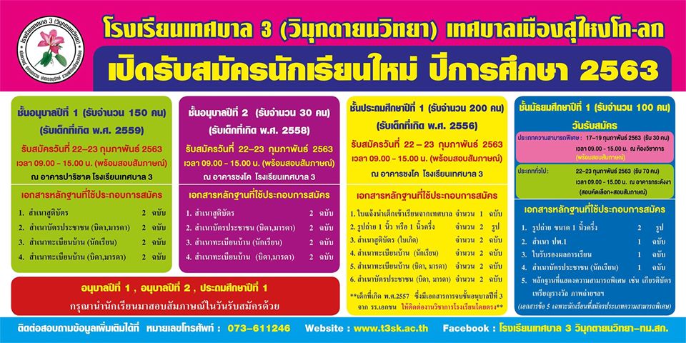 สอบถามข้อมูลเพิ่มเติมได้ที่ โทร.073-611246 หรือเฟซบุ๊ค "โรงเรียนเทศบาล 3 วิมุกตายนวิทยา-ทม.สก."
