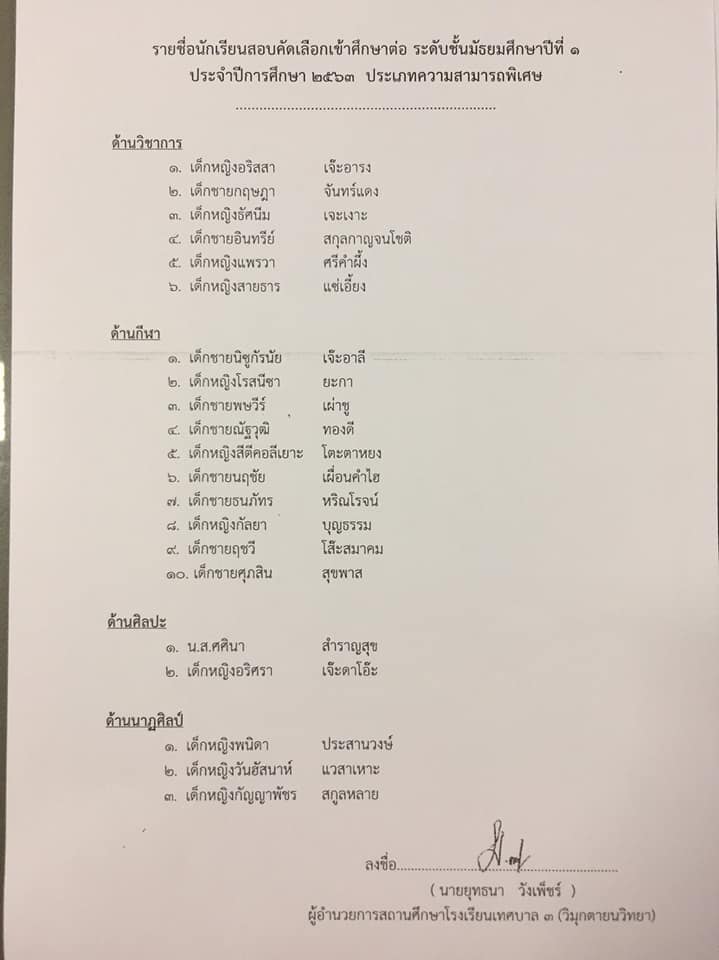ประกาศผลการสอบคัดเลือกเข้าศึกษาต่อระดับชั้นมัธยมศึกษาปีที่ 1 ประจำปีการศึกษา 2563 ประเภทความสามารถพิเศษ