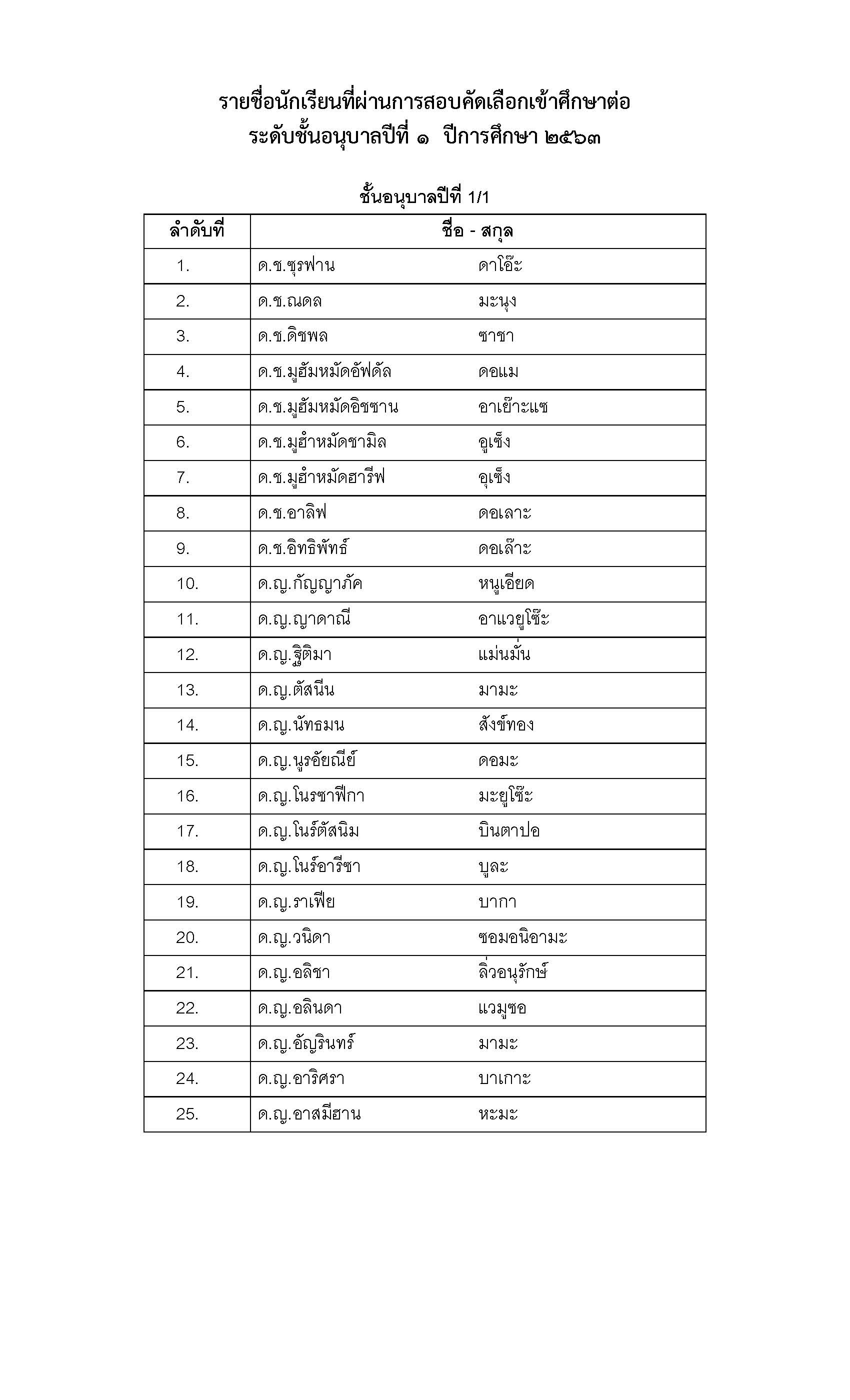 สำหรับผู้ผ่านการคัดเลือกชั้นอนุบาล 1 , 2