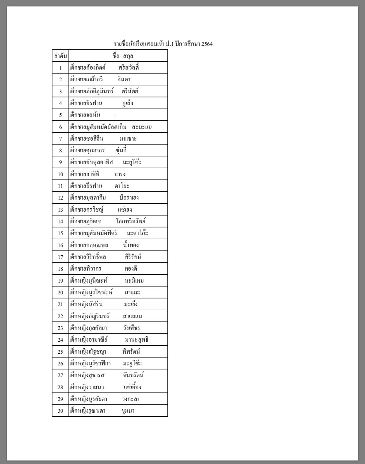 ผลการสอบคัดเลือกนักเรียนชั้นประถมศึกษาปีที่ 1 ปีการศึกษา 2564