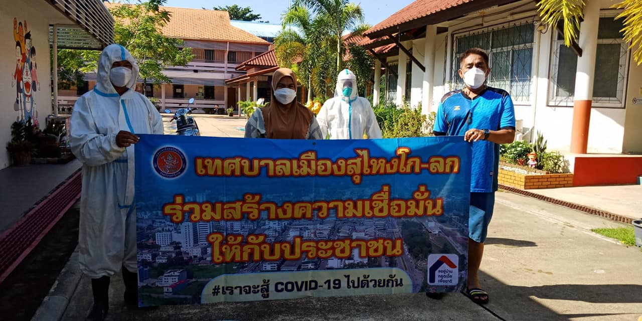 เจ้าหน้าที่จากกองสาธารณสุขและสิ่งแวดล้อมที่มาฉีดพ่นยาฆ่าเชื้อโรค เพื่อสร้างความเชื่อมั่นให้กับประชาชนในสถานการณ์การแพร่ระบาดของไวรัสโคโรน่า (Covid-19)