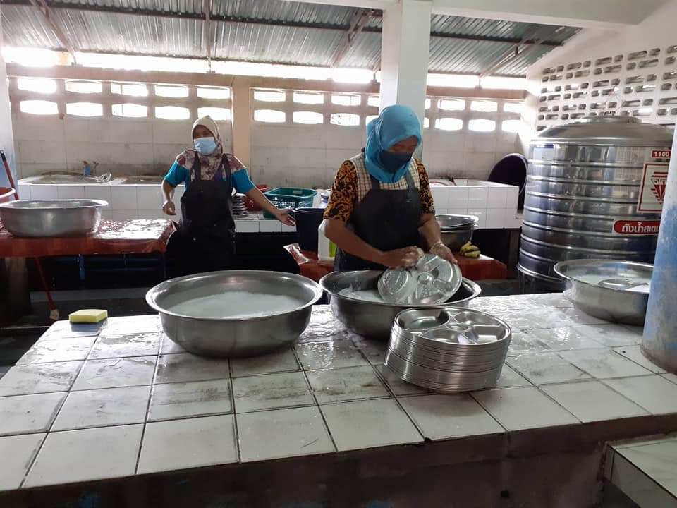 ทีมแม่ครัวร่วมกันทำความสะอาดเครื่องมือและของใช้ต่างๆ รวมทั้งทำความสะอาดห้องประกอบอาหารและโรงอาหาร