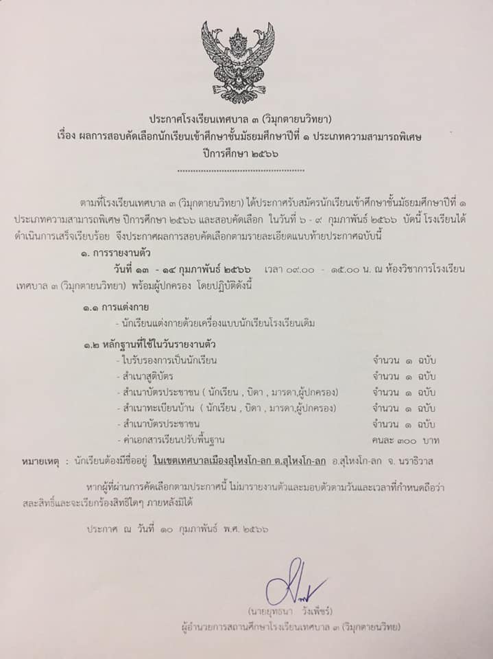 ผลการสอบคัดเลือกเข้าศึกษาต่อชั้นมัธยมศึกษาปีที่ 1 (รอบความสามารถพิเศษ)