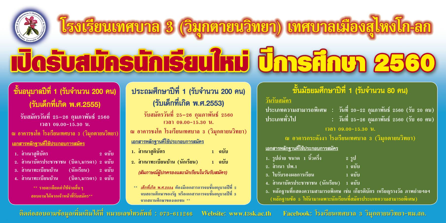 ประชาสัมพันธ์การรับสมัครนักเรียนประจำปีการศึกษา 2560 โรงเรียนเทศบาล 3 (วิมุกตายนวิทยา)