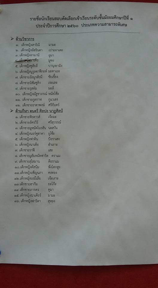 นักเรียนที่ผ่านการสอบคัดเลือก ม.1 รอบความสามารถพิเศษ ให้เตรียมเอกสารและมารายงานตัววันที่ 12 มีนาคม 2560
